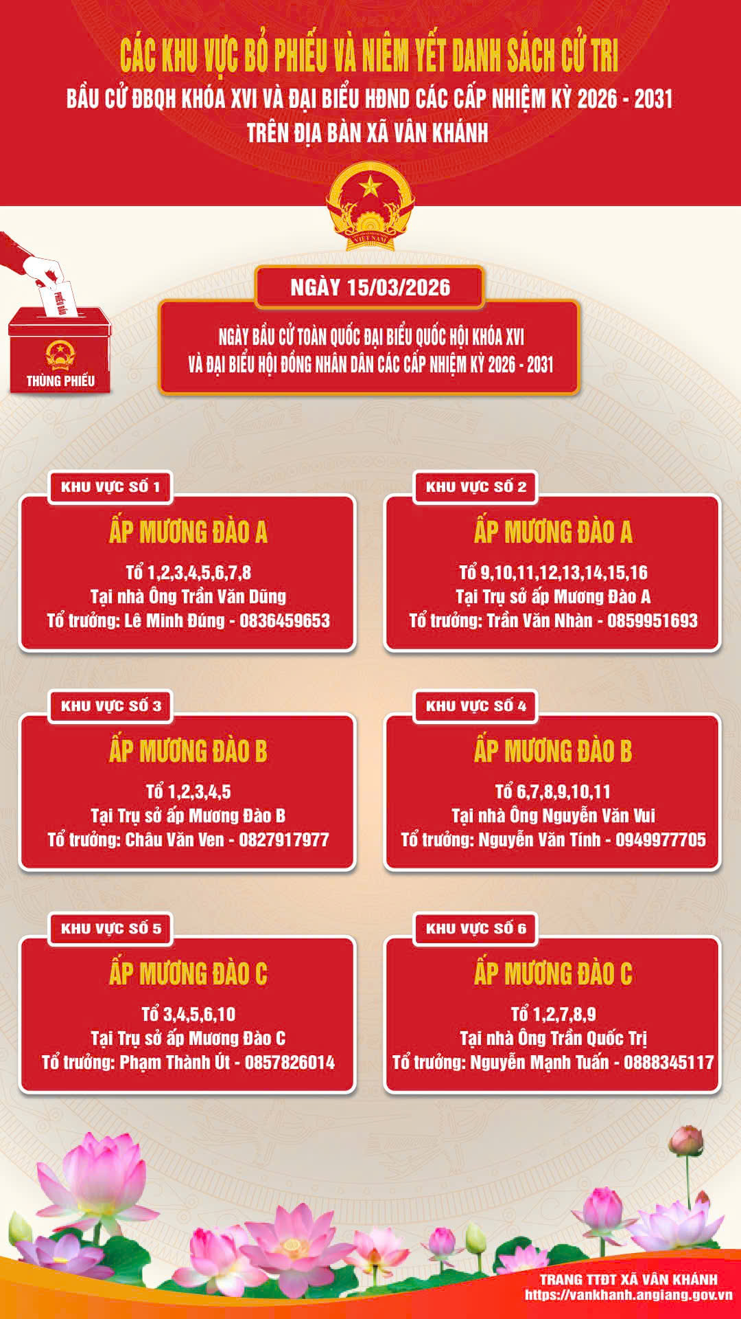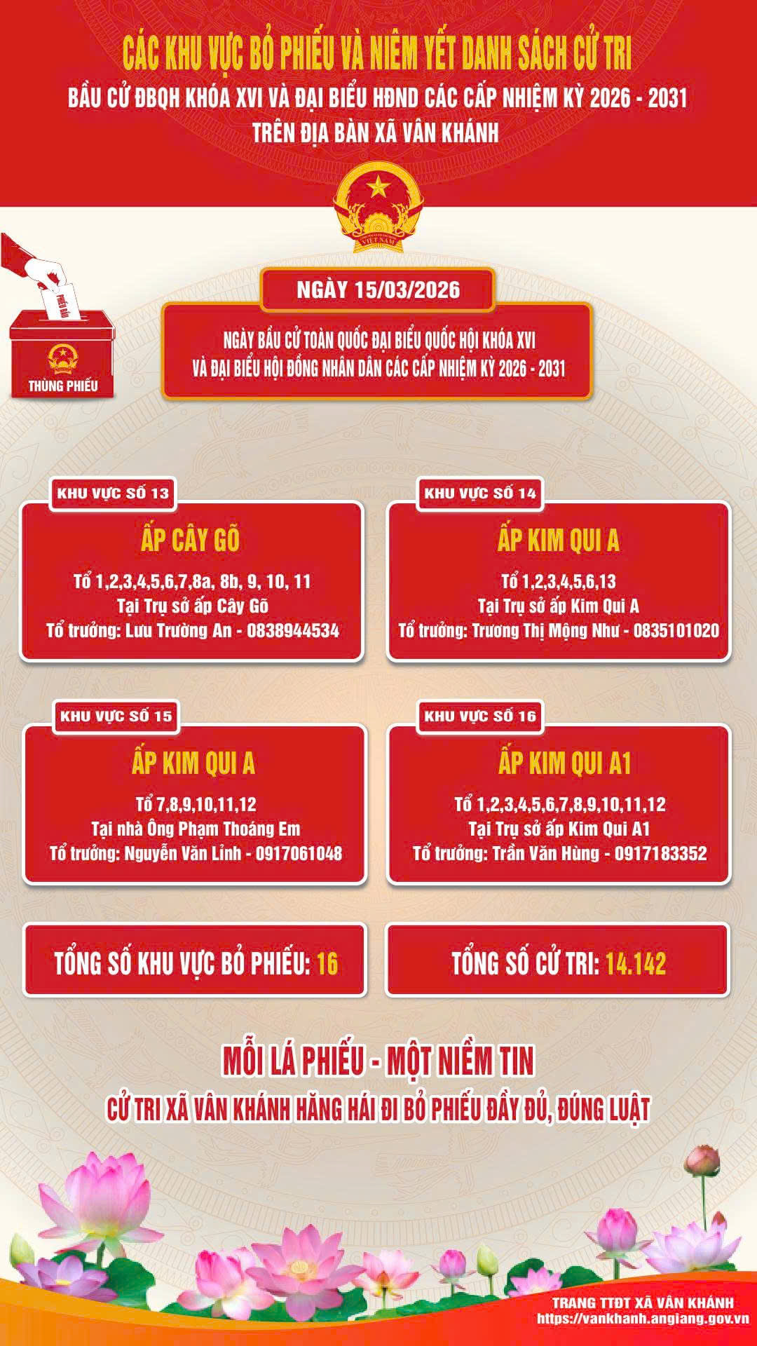 Các khu vực bỏ phiếu và niêm yết danh sách cử tri trên địa bàn xã Vân Khánh Bầu cử 10/03/2026 - aA + /cac-khu-vuc-bo-phieu-va-niem-yet-danh-sach-cu-tri-tren-dia-ban-xa-van-khanh Tin tức liên quan XÃ VÂN KHÁNH GẤP RÚT CHUẨN BỊ CHO CÔNG TÁC BẦU CỬ Tin tức sự kiện Văn hóa - Xã hội Xây dựng chính quyền Bầu cử Thông tin cần biết Thông tin tuyên truyền 10/03/2026