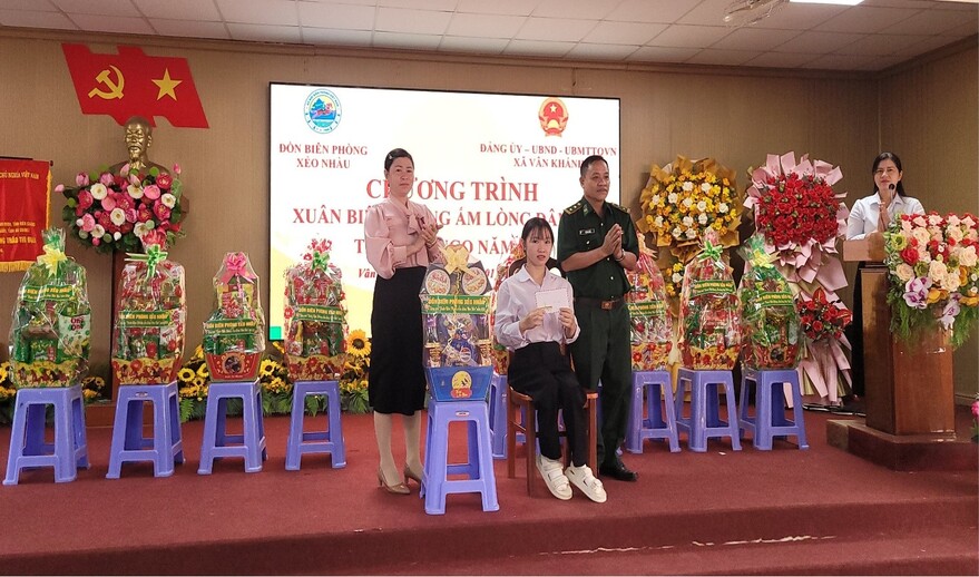 Tại chương trình, các đại biểu đã trao 11 phần quà cho bà con có hoàn cảnh khó khăn, mỗi phần gồm bánh, mứt, các nhu yếu phẩm phục vụ sinh hoạt hằng ngày và 500.000 đồng tiền mặt. Đồng thời, Đồn Biên phòng Xẻo Nhàu đã tặng 01 suất học bổng trong chương trình “Nâng bước em đến trường” cho học sinh có hoàn cảnh khó khăn vượt khó học tốt của Trường THCS & THPT Vân Khánh.