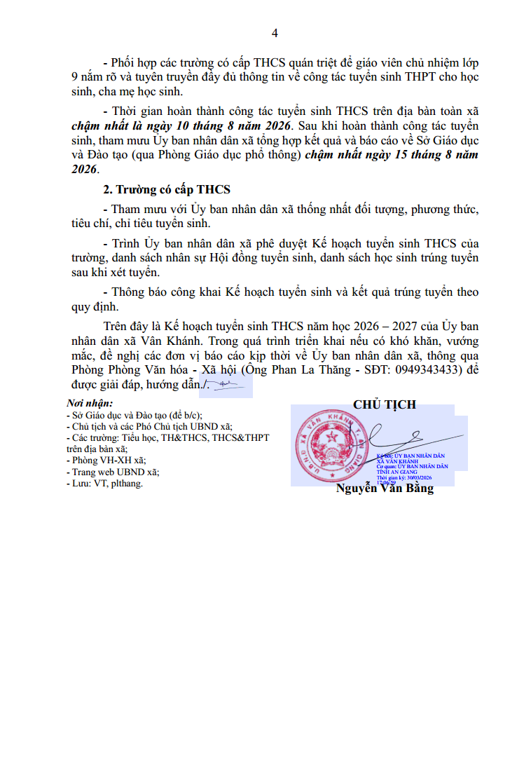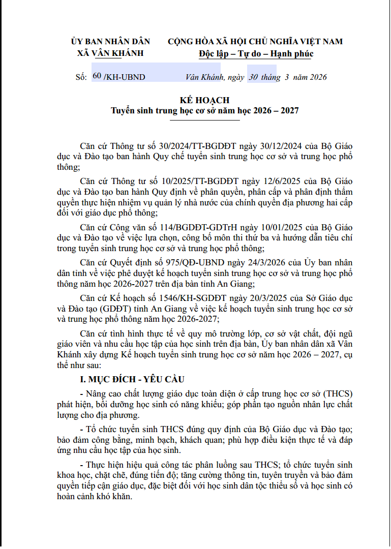Kế hoạch tuyển sinh trung học cơ sở năm học 2026 – 2027 Tin tức sự kiện Văn hóa - Xã hội 13/04/2026 - aA + /ke-hoach-tuyen-sinh-trung-hoc-co-so-nam-hoc-2026-2027 Tin tức liên quan ĐẢNG ỦY XÃ VÂN KHÁNH DỰ HỘI NGHỊ TRỰC TUYẾN TOÀN QUỐC NGHIÊN CỨU, HỌC TẬP, QUÁN TRIỆT VÀ TRIỂN KHAI NGHỊ QUYẾT HỘI NGHỊ LẦN THỨ HAI BAN CHẤP HÀNH TRUNG ƯƠNG ĐẢNG KHÓA XIV Tin tức sự kiện Đảng, đoàn thể 13/04/2026 Tuyên truyền chính sách BHXH tự nguyện, BHYT tháng 4 năm 2026 trên địa bàn xã Vân Khánh Tin tức sự kiện Văn hóa - Xã hội Thông báo Thông tin tuyên truyền 13/04/2026 Thời gian địa điểm mở tài khoản trên địa bàn xã Vân Khánh Tin tức sự kiện 13/04/2026 ỦY BAN NHÂN DÂN XÃ VÂN KHÁNH TỔ CHỨC HỘI NGHỊ KHEN THƯỞNG CHÍNH SÁCH DÂN SỐ GẮN VỚI TỔNG KẾT CÔNG TÁC Y TẾ NĂM 2025 Tin tức sự kiện Văn hóa - Xã hội 13/04/2026 Thông báo lịch chi trả chế độ chính sách trợ giúp xã hội xã Vân Khánh tháng 4/2026 Tin tức sự kiện Văn hóa - Xã hội 08/04/2026 BAN THƯỜNG VỤ ĐẢNG UỶ XÃ VÂN KHÁNH KHẢO SÁT CÔNG TÁC XÂY DỰNG ĐẢNG, CÔNG TÁC KIỂM TRA, GIÁM SÁT VÀ CHUYỂN ĐỔI SỐ QUỐC GIA TẠI CÁC CHI BỘ TRỰC THUỘC Tin tức sự kiện Đảng, đoàn thể 08/04/2026