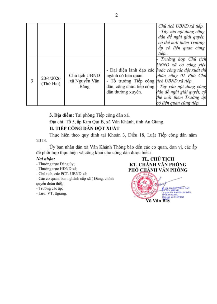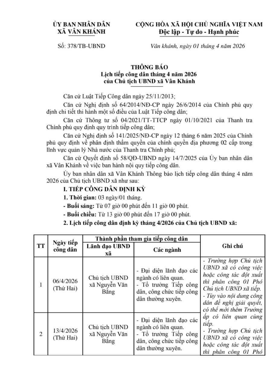 Lịch tiếp công dân tháng 4 năm 2026 của Chủ tịch UBND xã Vân Khánh Tin tức sự kiện Lịch tiếp công dân Thông báo 03/04/2026 - aA + /lich-tiep-cong-dan-thang-4-nam-2026-cua-chu-tich-ubnd-xa-van-khanh Tin tức liên quan Lịch làm việc của Thường trực Hội đồng nhân dân xã từ ngày 01 đến ngày 15/4/2026 Tin tức sự kiện Thông báo 03/04/2026 Phân công tiếp công dân tháng 4 năm 2026 của Bộ phận tiếp công dân Tin tức sự kiện Thông báo 03/04/2026 CHI HỘI BẢO TRỢ BỆNH NHÂN NGHÈO XÃ VÂN KHÁNH TRAO TIỀN HỖ TRỢ CHO BỆNH NHÂN Tin tức sự kiện Đảng, đoàn thể 03/04/2026 Vân Khánh làm tốt công tác vận động xây dựng nhà “Đại đoàn kết” cho hộ nghèo, cận nghèo năm 2026 Tin tức sự kiện Đảng, đoàn thể 01/04/2026 Đảng uỷ xã Vân Khánh tổ chức Hội nghị tập huấn học tập, quán triệt và triển khai Nghị quyết số 79-NQ/TW và Nghị quyết số 80-NQ/TW của Bộ Chính trị Tin tức sự kiện Đảng, đoàn thể 01/04/2026 HĐND XÃ HỌP CHUYÊN ĐỀ VỀ TÀI CHÍNH NGÂN SÁCH Tin tức sự kiện Đảng, đoàn thể 31/03/2026