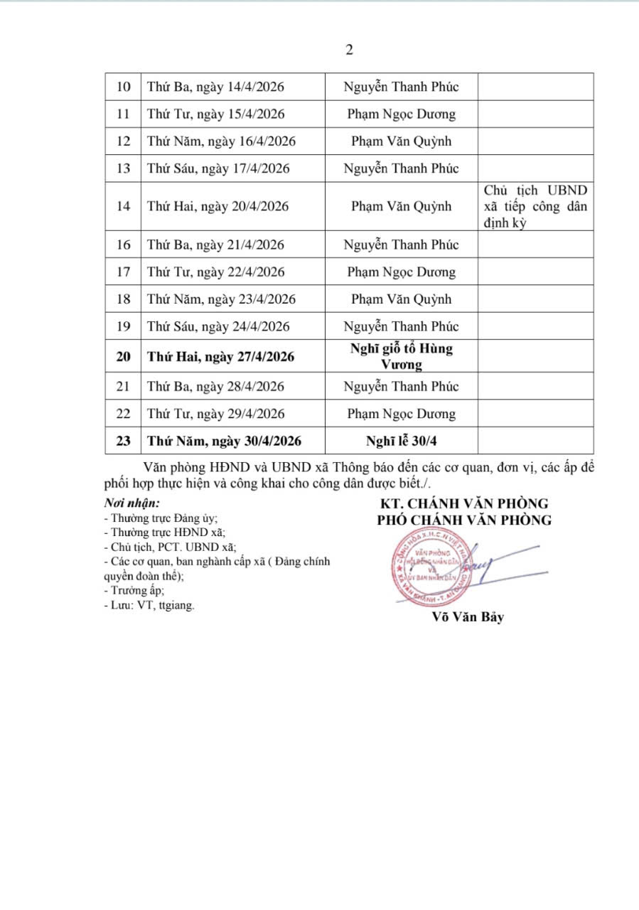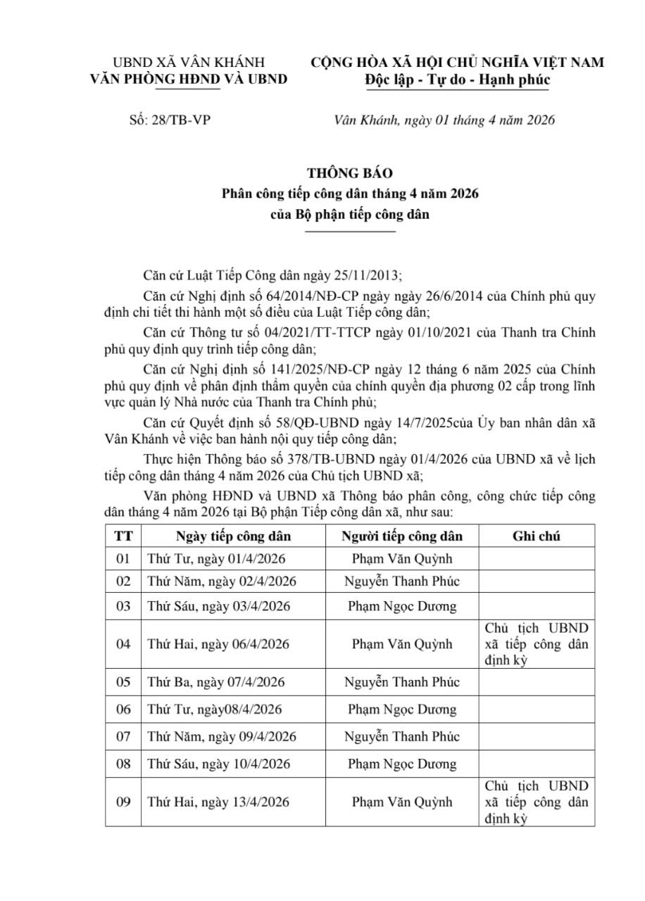 Phân công tiếp công dân tháng 4 năm 2026 của Bộ phận tiếp công dân Tin tức sự kiện Thông báo 03/04/2026 - aA + /phan-cong-tiep-cong-dan-thang-4-nam-2026-cua-bo-phan-tiep-cong-dan Tin tức liên quan Lịch làm việc của Thường trực Hội đồng nhân dân xã từ ngày 01 đến ngày 15/4/2026 Tin tức sự kiện Thông báo 03/04/2026 Lịch tiếp công dân tháng 4 năm 2026 của Chủ tịch UBND xã Vân Khánh Tin tức sự kiện Lịch tiếp công dân Thông báo 03/04/2026 CHI HỘI BẢO TRỢ BỆNH NHÂN NGHÈO XÃ VÂN KHÁNH TRAO TIỀN HỖ TRỢ CHO BỆNH NHÂN Tin tức sự kiện Đảng, đoàn thể 03/04/2026 Vân Khánh làm tốt công tác vận động xây dựng nhà “Đại đoàn kết” cho hộ nghèo, cận nghèo năm 2026 Tin tức sự kiện Đảng, đoàn thể 01/04/2026 Đảng uỷ xã Vân Khánh tổ chức Hội nghị tập huấn học tập, quán triệt và triển khai Nghị quyết số 79-NQ/TW và Nghị quyết số 80-NQ/TW của Bộ Chính trị Tin tức sự kiện Đảng, đoàn thể 01/04/2026 HĐND XÃ HỌP CHUYÊN ĐỀ VỀ TÀI CHÍNH NGÂN SÁCH Tin tức sự kiện Đảng, đoàn thể 31/03/2026