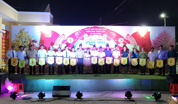 Ông Nguyễn Văn Bằng – Phó Bí thư Đảng ủy, Chủ tịch UBND và bà Nguyễn Thị Mỹ Nga - Trưởng phòng Văn hóa & Xã hội xã Vân Khánh tặng cờ lưu niệm cho các đơn vị tham gia hội thi