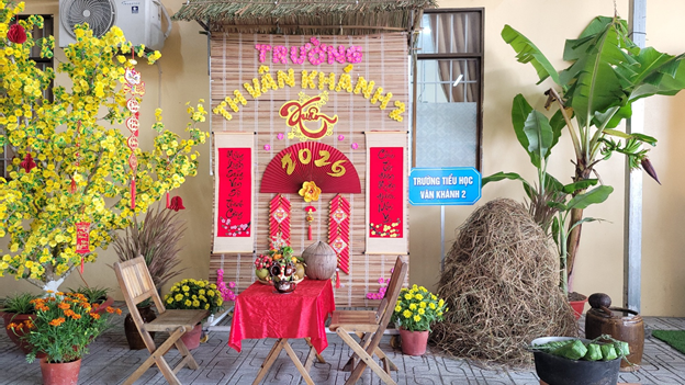 Nhiều tiểu cảnh được thiết kế từ vật liệu thân thiện môi trường như tre, rơm, vật liệu tái chế… tái hiện sinh động không gian Tết quê. Hình ảnh mái nhà tranh, ông đồ, cây nêu, câu đối đỏ, hoa mai, hoa đào, nồi bánh chưng, bánh tét, bao lì xì, lồng đèn… được sắp đặt hài hòa, tạo nên bức tranh Tết rực rỡ, ấm áp.