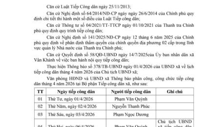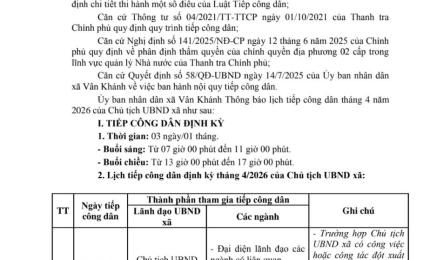 Lịch tiếp công dân tháng 4 năm 2026 của Chủ tịch UBND xã Vân Khánh