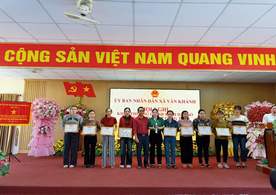 Ông Nguyễn Quốc Khánh, Phó Giám đốc phụ trách Trạm y tế xã và bà Phan Thị Út, Chủ tịch Hội Liên hiệp Phụ nữ xã Vân Khánh trao tặng Giấy khen
