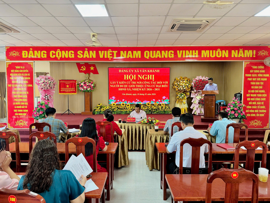 Thực hiện Luật Bầu cử đại biểu Quốc hội và đại biểu Hội đồng nhân dân (HĐND); căn cứ kế hoạch tổ chức lấy ý kiến cử tri đối với người ứng cử đại biểu Hội đồng nhân dân các cấp nhiệm kỳ 2026–2031. Sáng ngày 10/01/2026 Đảng ủy xã Vân Khánh tổ chức Hội nghị lấy ý kiến cử tri nơi công tác đối với người ứng cử đại biểu HĐND xã Vân Khánh nhiệm kỳ 2026–2031 nghiêm túc, đúng quy trình, quy định. Hội nghị do ông Huỳnh Xuân Luật, Bí thư Đảng ủy xã chủ trì. Tham dự Hội nghị có các đồng chí Uỷ viên Ban chấp hành Đảng uỷ xã, Trưởng, Phó các cơ quan tham mưu, giúp việc Đảng uỷ xã; Trưởng, phó Phòng thuộc UBND xã, Chủ tịch, Phó Chủ tịch Ủy ban Mặt trận Tổ quốc Việt Nam và các Tổ chức chính trị xã hội và toàn thể cử tri là cán bộ, công chức, và người hoạt động không chuyên trách thuộc khối Đảng, UBND, UB MTTQVN xã.