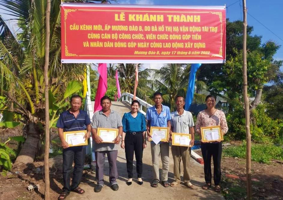 Cầu bắt qua Kênh Mới thuộc ấp mương Đào B xã Vân Khánh được xây dựng bằng bê tông có chiều dài 25 mét, mặt cầu rộng 2,8 mét, tổng trị giá 180 triệu đồng, trong đó, Tổ chỉ đạo toàn diện xã Vân Khánh và cán bộ, công chức, viên chức của xã, tập thể giáo viên trường Mầm non, Trường tiểu học Vân Khánh 1, Trường tiểu học Vân Khánh 2 đóng góp 35 triệu 700 ngàn đồng, phần còn lại do bà Hồ Thị Hạ, ngụ ấp Mương Đào xã Vân Khánh Đông vận động các mạnh thường quân trong và ngoài địa bàn hỗ trợ 144 triệu 300 ngàn đồng.