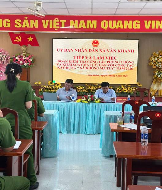 Tại buổi làm việc Đoàn đã kiểm tra thực tế việc cụ thể hoá, triển khai thực hiện các văn bản của Trung ương, tỉnh đối với Ủy ban nhân dân xã và các văn bản chỉ đạo, điều hành của Ủy ban nhân dân xã đối với ngành chuyên môn. Ủy ban nhân dân xã đã tham mưu cho Ban Thường vụ Đảng uỷ xã xây dựng Nghị quyết số 06-NQ/ĐU ngày 06/04/2026 thực hiện Nghị quyết số 03-NQ/TU ngày 03/10/2025 của Ban Thường vụ Tỉnh uỷ về "Tăng cường sự lãnh đạo của Đảng đối với công tác phòng, chống ma túy trong tình hình mới trên địa bàn xã Vân Khánh, giai đoạn 2025 - 2030, Nghị quyết số 05-NQ/ĐU ngày 06/04/2026 về tăng cường sự lãnh đạo của Đảng đối với công tác phòng, chống tội phạm trên địa bàn xã Vân Khánh, giai đoạn 2025 – 2030; Ủy ban nhân dân xã xây dựng Kế hoạch số 42/KH-UBND ngày 09/03/2026 về xây dựng xã, phường, đặc khu không ma túy năm 2026; Kế hoạch số 43/KH-UBND ngày 10/3/2026 về triển khai thực hiện Chương trình mục tiêu quốc gia phòng, chống ma túy đến năm 2030 và Nghị quyết số 03-NQ/TU ngày 03/10/2025 của Ban Thường vụ Tỉnh ủy về tăng cường sự lãnh đạo của Đảng đối với công tác phòng, chống ma túy trong tình hình mới trên địa bàn xã Vân Khánh năm 2026; Kế hoạch số 46/KH-UBND ngày 11/03/2026 về xây dựng xã, phường, đặc khu không ma túy giai đoạn 2025-2030; Kế hoạch số 47/KH-UBND ngày 10/3/2026 về thực hiện Dự án thuộc Chương trình mục tiêu quốc gia phòng, chống ma túy đến năm 2030 trên địa bàn xã… góp phần từng bước xây dựng xã hội, trật tự, kỷ cương, an toàn, lành mạnh. Đẩy mạnh phong trào toàn dân bảo vệ an ninh Tổ quốc, chủ động phòng ngừa tội phạm từ sớm, từ xa và ngay tại cơ sở, tiếp tục giữ vững “xã không ma túy”. Tạo chuyển biến mạnh mẽ trong công tác xây dựng Đảng, xây dựng lực lượng Công an. Nâng cao uy tính, hình ảnh người Công an cách mạng trung thành với Đảng, tận tụy với Nhân dân, vì nước quên thân, vì dân phục vụ; cán bộ chiến sĩ chấp hành nghiêm kỷ luật, kỷ cương, điều lệnh Công an nhân dân. Hiện xã không có trường hợp cay nghiện, quản lý sau cai nghiện 01 trường hợp, đang quản lý người sử dụng trái phép chất ma túy ngoài xã hội 09 trường hợp.